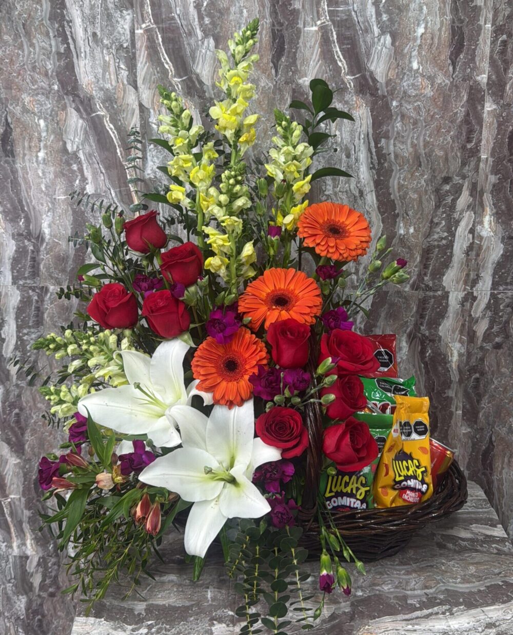 Canasta con diseño de flores suritdas colorido y selección de productos comerciales (Frituras, gomitas, dulces y refrescos)