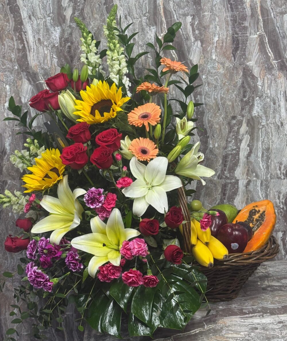 Canasta frutal con arreglo floral surtido de Rosas, Gerberas, Lirios, Margaritas, y selección de finos follajes., acompañado de selección de fruta fresca de temporada.