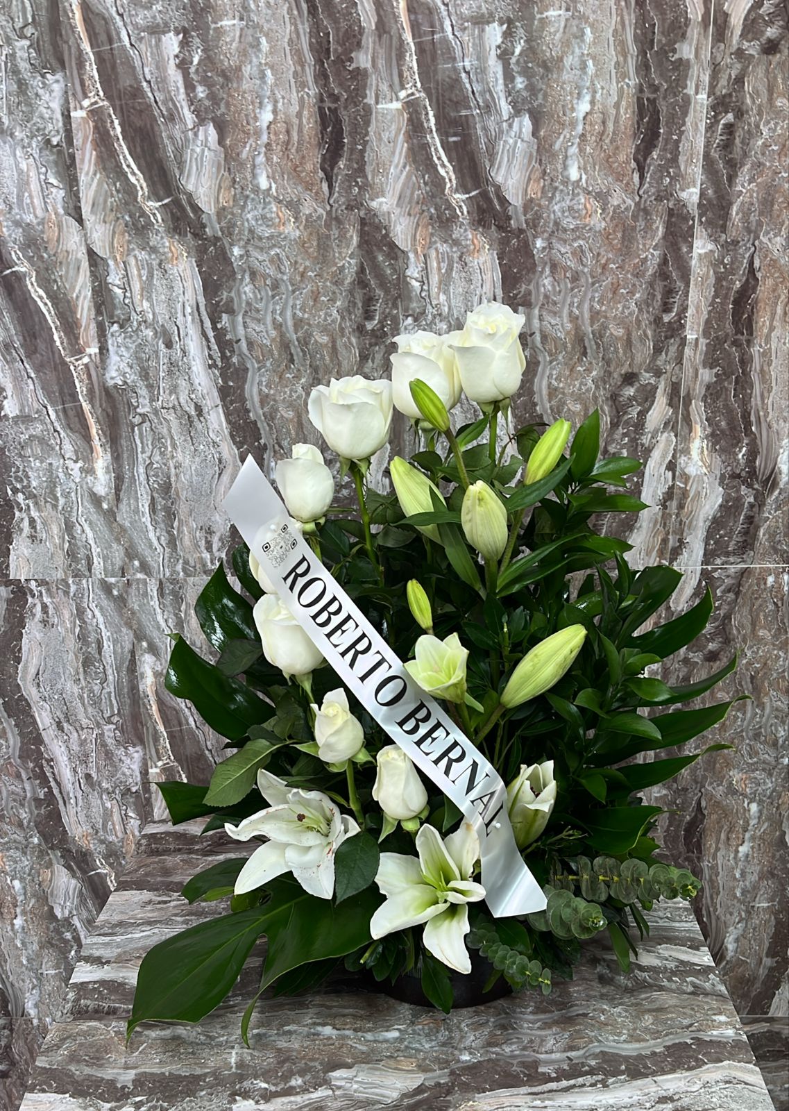 Arreglo en base de cerámica, diseño en espiral con 8 Rosas Blancas. Elaborado con la mejor selección de Rosas y Lilys en tonos blancos acompañadas de finos follajes.