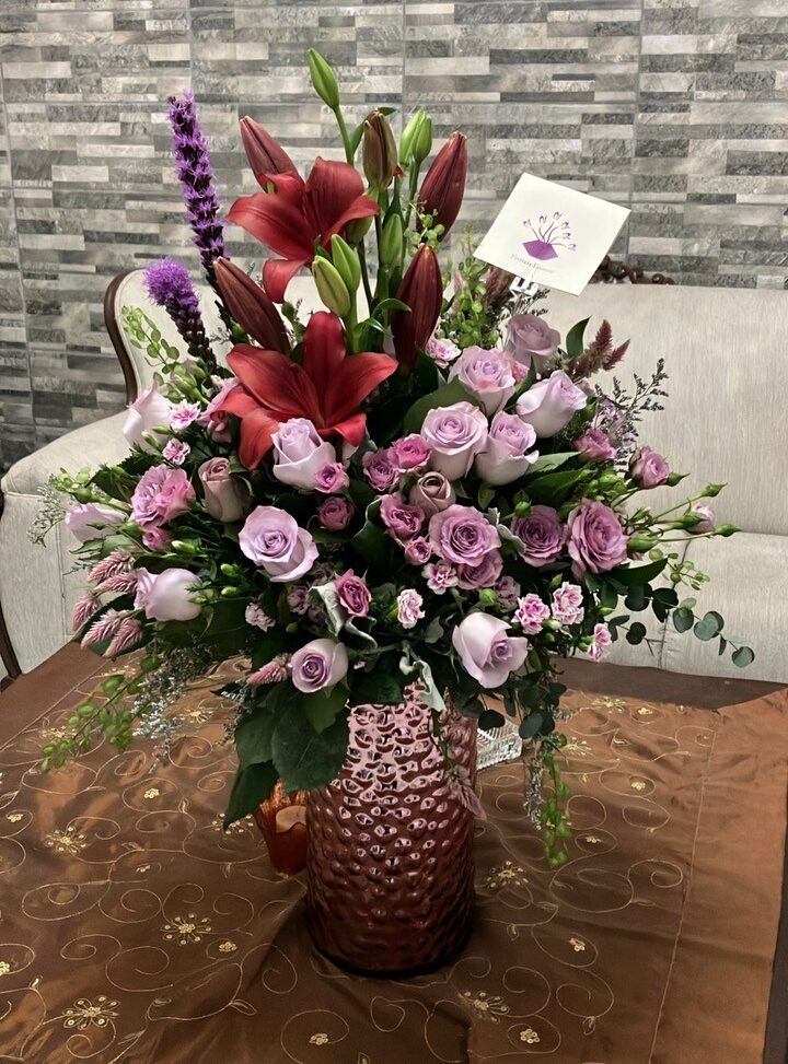— Lilys rojos, rosas lila y flores mixtas en tonos púrpura —